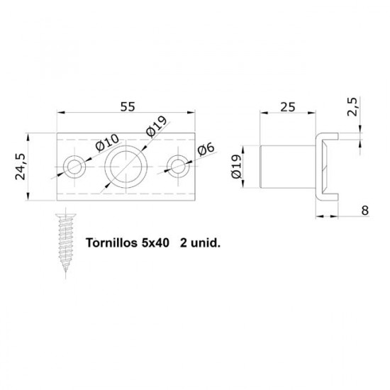 Le guide inférieur U-19 à visser étroit est une ferrure accessoire pour portes coulissantes suspendues en bois. Cette ferrure sert de guide inférieur sur les portes coulissantes en bois étroites. Il se fixe à la porte avec deux vis. Nous fournissons le guide avec deux vis.
