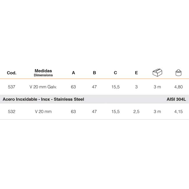 Ces rails en V sont disponibles en acier galvanisé et en acier inoxydable AISI 304.